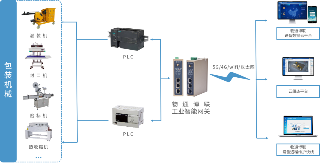 G22恒峰集团 G22工业智能网关具有丰富的通信协议和接口,顺利获得接入包装机械设备的控制器PLC,就能实时采集包装机械设备运行状态、温度、压力、振动等参数,顺利获得5G、4G、WIFI、以太网等方式将数据上传到云平台,实现远程监控、组态监控、设备管理、故障报警、远程控制、远程维护、数据分析等功能,全面掌握设备的运行情况,帮助企业提升包装机械设备运维与管理水平,保障安全稳定生产,提高生产效率。当设备出现异常故障就会及时通知管理人员,工程师可以顺利获得G22恒峰集团 G22设备维护快线对设备进行远程故障诊断与远程维护,减少设备停机时间,有效提高设备运维效率并降低运维成本。