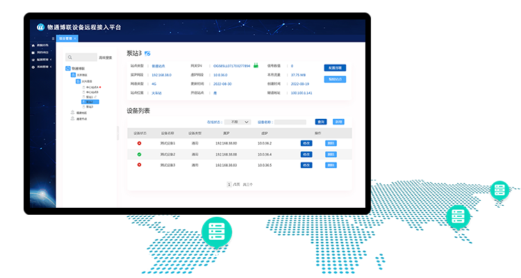 顺利获得运营大屏实现对在线的设备,在线网关的统计分析,对设备及项目地图分布进行统计,对网关、设备及通道异常报警进行监测。