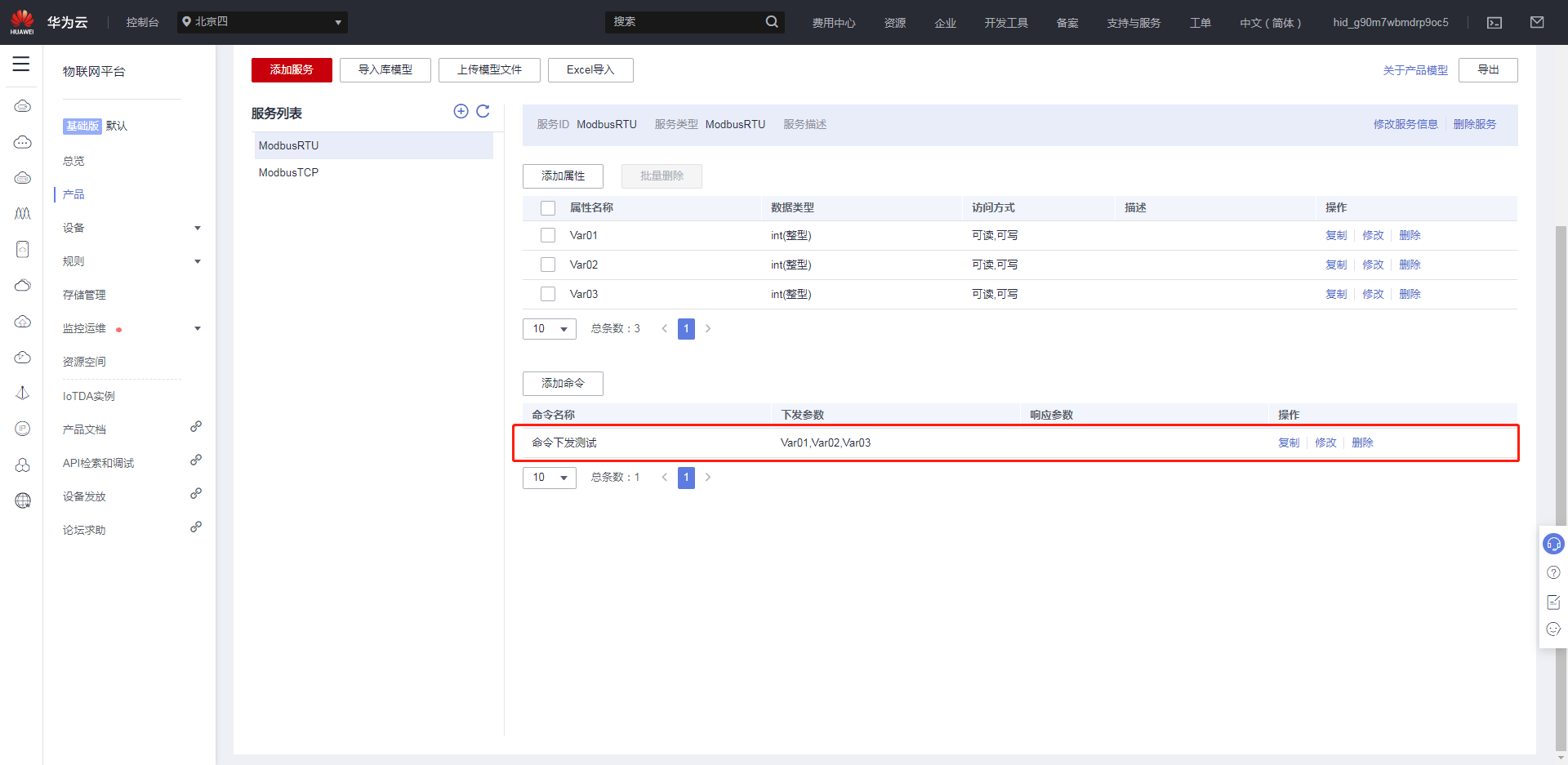 华为云反控设定:点击添加命令,定义命令名称,新增输入参数,建立需要下发写的参数,“参数名称”要与需要下发写的“属性名称”对应