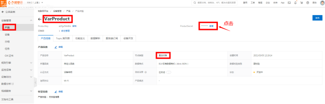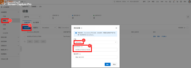 选择刚添加产品设备的名称,这里DeviceName填的是设备的名称定义(可根据实际场景)详见图2