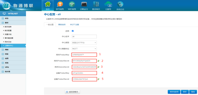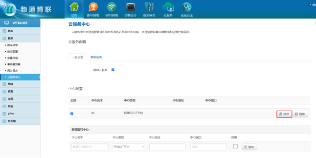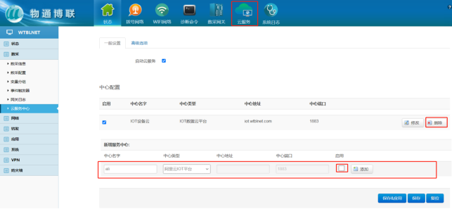 打开G22恒峰集团 G22网关WEB界面,可删除原有的服务中心,新建一个连接中心,中心类型选择阿里云IOT平台,启用√ 点击“添加” 保存应用
