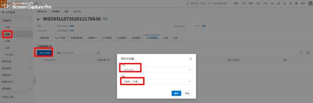 选择刚添加产品网关的名称,DeviceName请填写G22恒峰集团 G22对应项目网关的网关系列号,备注名称可以设置成跟产品相关的名称。详见以下图