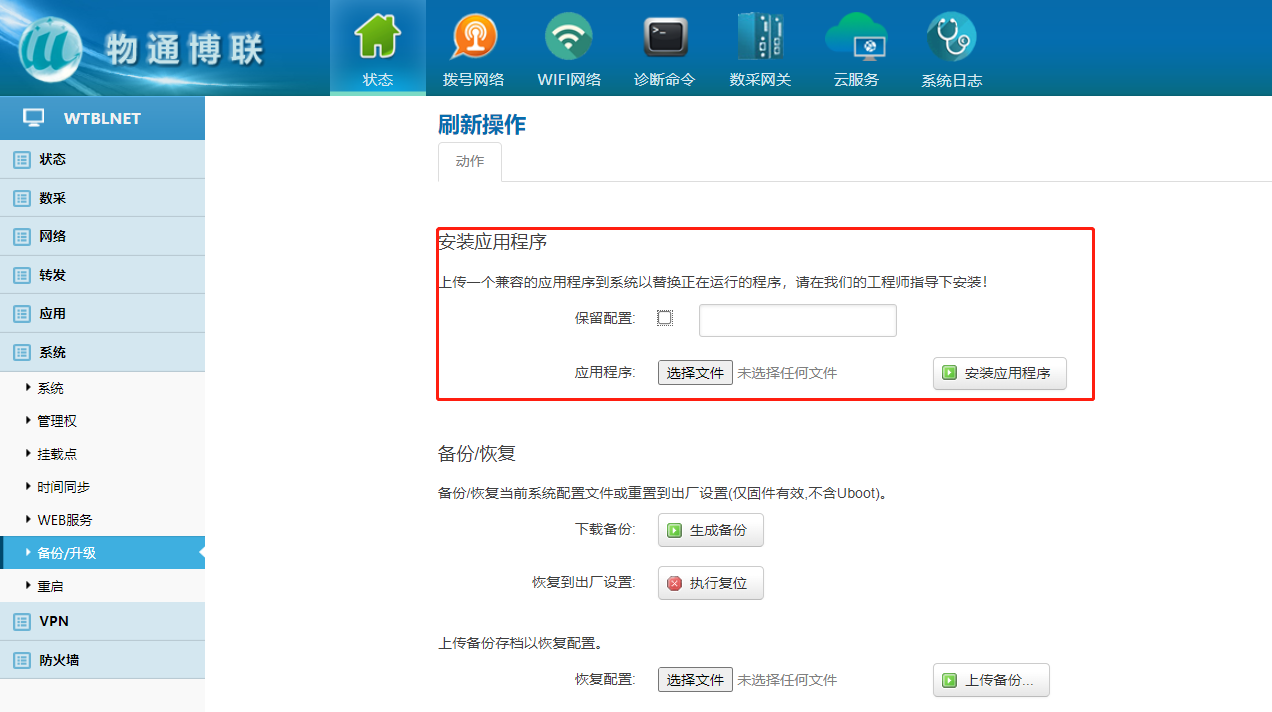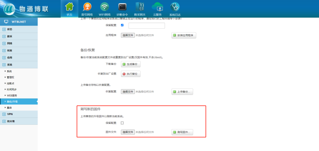 下载中心 视频中心 常见问题 售后服务 工业网关 设备快线 数据云平台 联网设备 问答百科 工业智能网关如何更新程序和固件? 时间:2022-10-26 09:39:53 点击:5224 关键词:工业智能网关,网关配置,固件升级 问题:工业智能网关如何更新程序和固件? 回答: (1)固件升级:后缀为。bin的文件 点击系统—备份/升级—选择文件—刷写程序(不保留配置) (2)IPK文件升级:后缀为。ipk的文件 点击系统—备份/升级—选择文件—输入密码—安装应用程序(不保留配置) 上一篇:工业智能网关时间如何进行同步? 下一篇: 工业智能网关如何连接wifi热点?