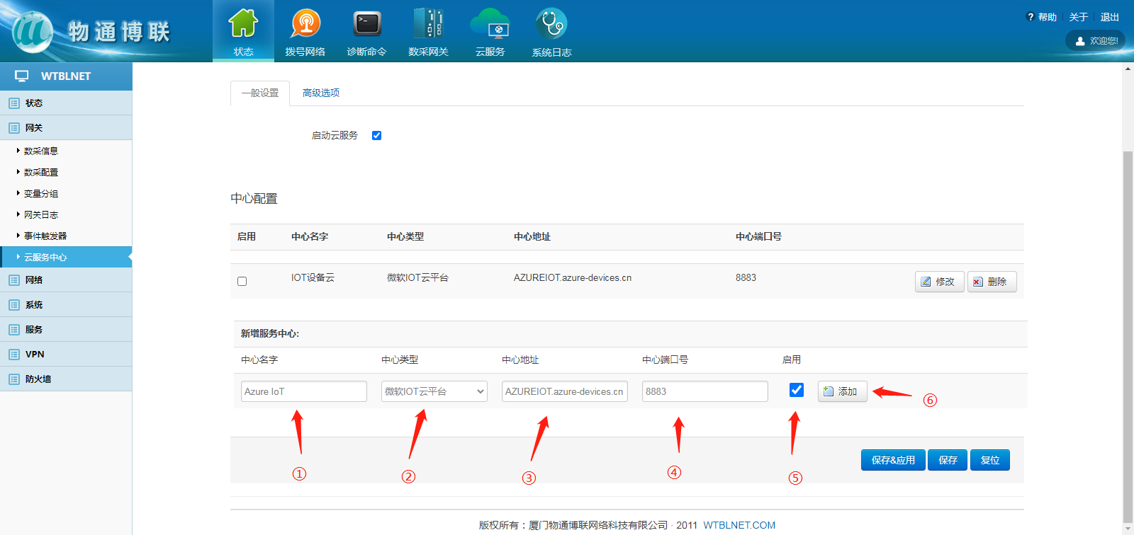 3、打开G22恒峰集团 G22网关WEB界面,新建一个连接中心,中心类型选择微软IoT云平台,输入相应信息,勾选启用,点击“添加” ,填写对应数据即可实现设备数据上传到微软Azure IoT物联网平台。