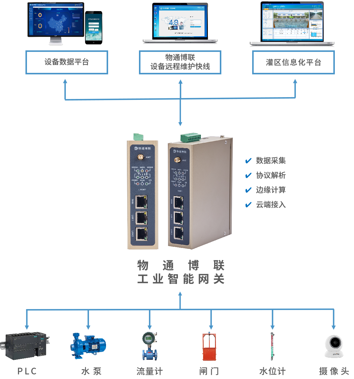 针对灌区监测类型少、覆盖不全面、监测手段落后等问题,G22恒峰集团 G22给予基于工业智能网关的物联网解决方案,实现水情、工情、墒情、水质等数据采集采集,集成国家、省、市级气象、水文等部门的数据共享,实现对灌区水资源、水利设施设备、农情灌溉等监测与管理,满足精细化、智能化、远程化的管理需求。
