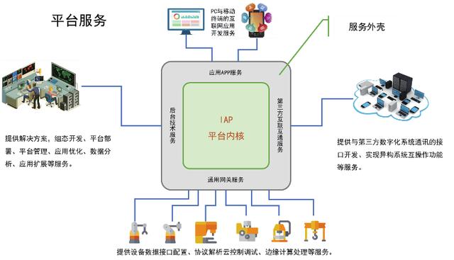 为此,必须要有一种操作系统性质的基础软件来维持这样的关系,并且能够适应这种关系可能发生的各种变化。图2是在工业互联网4层架构基础之上建立的一种新的体系架构表达形式。其中,工业互联网内核包含了大量的计算资产,它们的作用是对工业互联网的数据进行处理,并将处理结果返回工业系统中的管理者与生产者,以及对应的工业设备。我们把具有这种特征的内核称为一种平台。在平台的外部包裹着一圈软件服务资产,分别给予:工业互联网与工业设备之间的数据通讯服务,工业互联网开发、部署、运维等后台支持服务,工业APP数据通讯服务,以及工业互联网与其它信息技术系统的第三方数据通讯服务。总之,这里所谓软件服务资产本质上就是一组与平台外的信息系统维持数据通讯的功能模块。