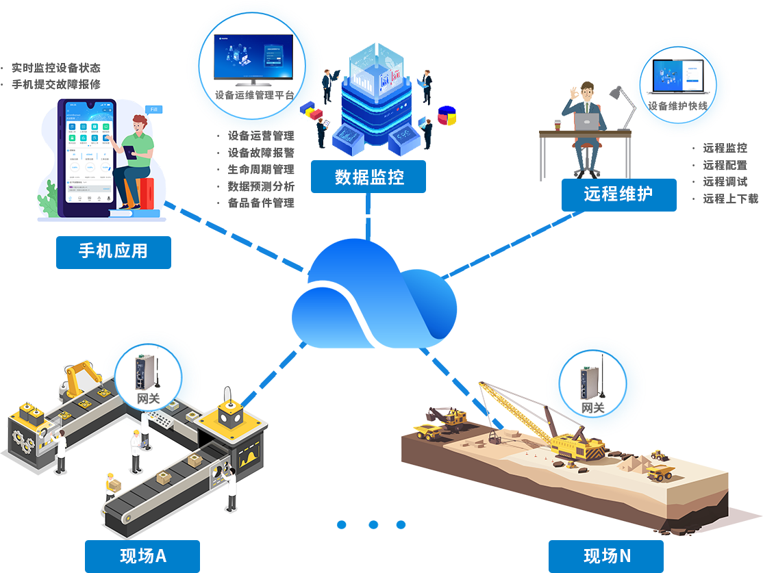 G22恒峰集团 G22针对设备制造商的装备数字化需求,构建了“终端数据采集-多网融合传输-云端智能运维-远程协同服务”的全周期技术解决方案:以工业智能网关为核心,采集装备运行参数、运行状态等数据,顺利获得 5G/4G/WiFi/ 以太网等方式将标准化数据实时上传至设备运维管理平台。平台借大数据分析与故障诊断算法,实现数据监控、趋势预测与异常识别,设备存故障风险时自动触发预警。依托设备维护快线,可远程完成程序上下载、参数调试等操作,提升维护效率、降低运维成本,助力设备制造商实现装备全生命周期数字化管理。