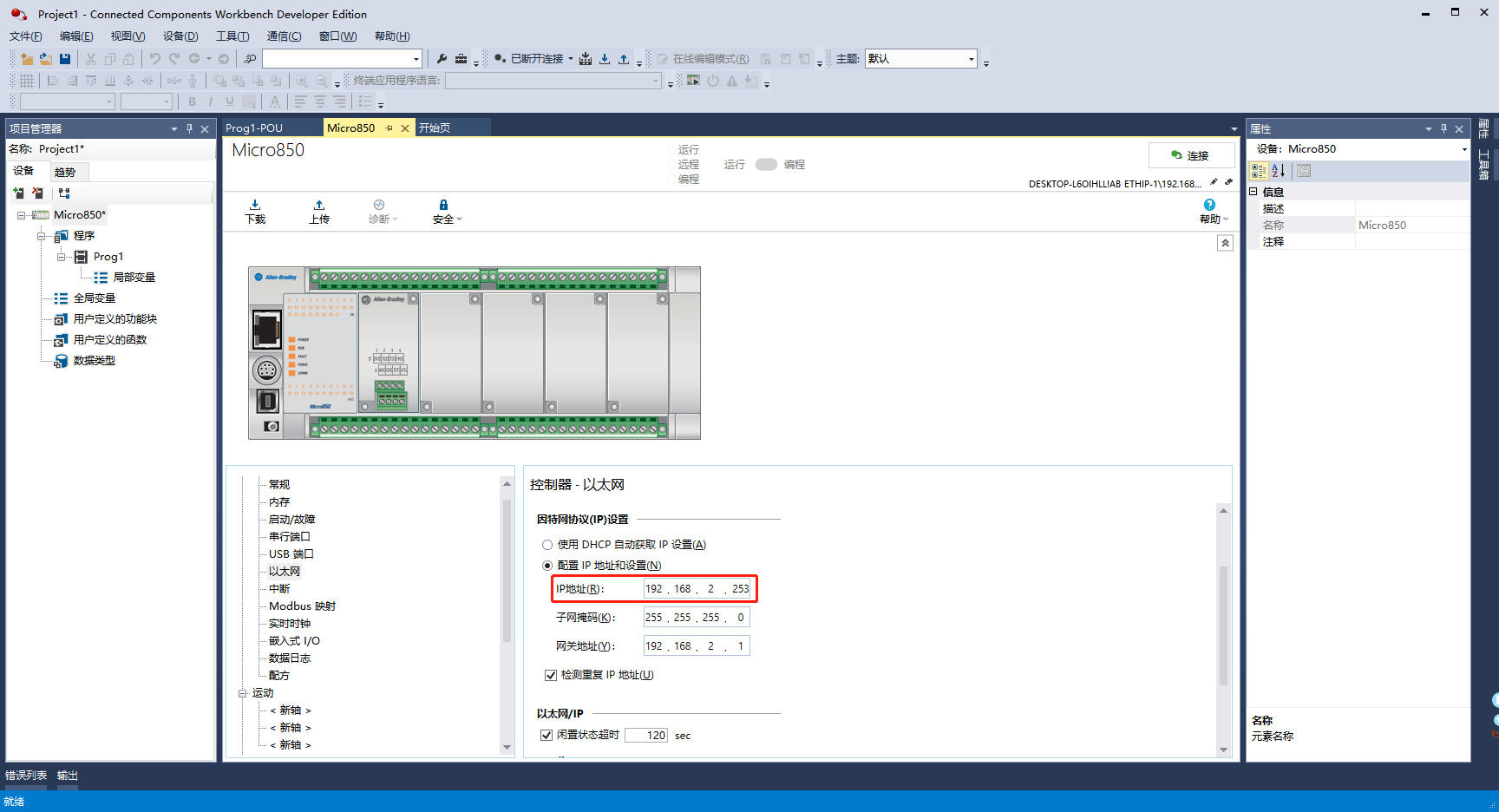 工具/材料: 1、笔记本电脑(或带双网卡的台式电脑)、线材(网线) 2、G22恒峰集团 G22·工业智能网关 3、Connected Components Workbench编程软件 操作步骤 1 以太网通讯设置 PLC采用网口通信,请确保PLC的地址和网关LAN口地址在同一个网段。网关LAN口地址(默认:192.168.2.1)可登陆网关WEB管理界面:网络-LAN内网地址中修改。 1、Allen-Bradley Micro850与电脑顺利获得网络连接,利用Connected Components Workbench获取与设置IP地址、子网掩码与默认网关。  2、Allen-Bradley Micro850网口顺利获得网线连接网关LAN口(200系列网关连接FE1)。