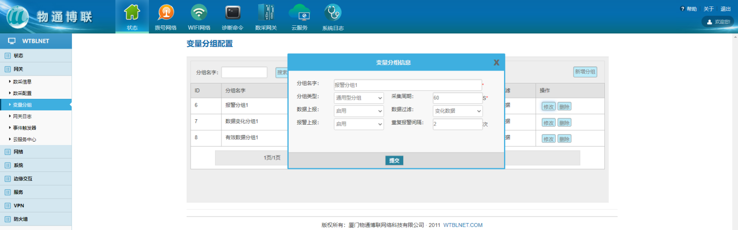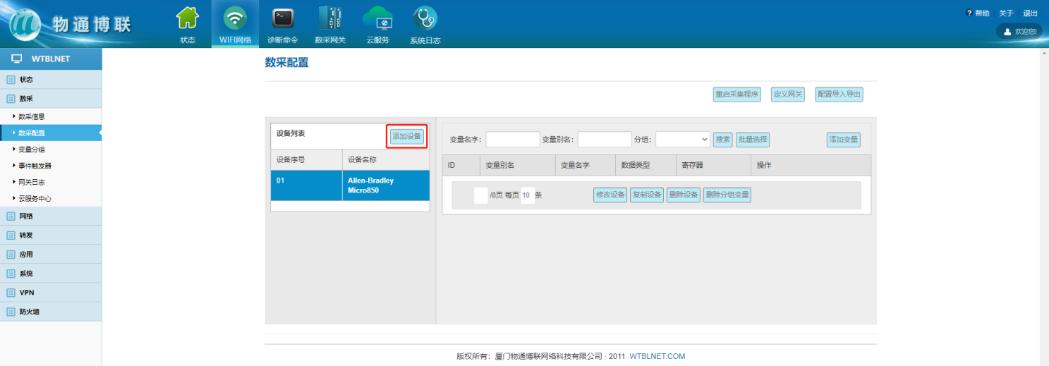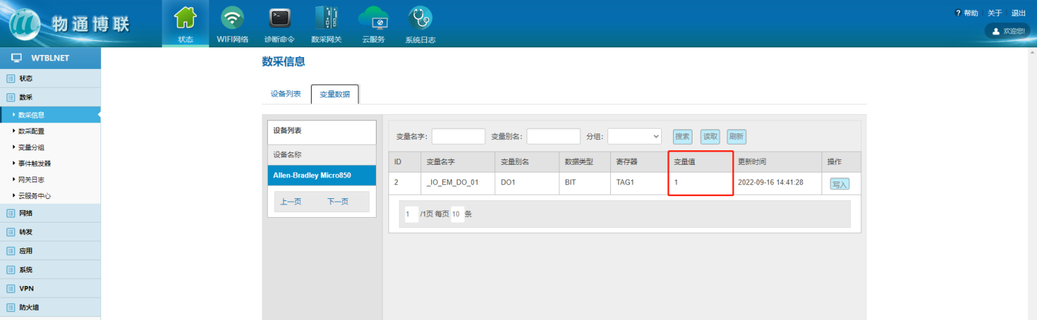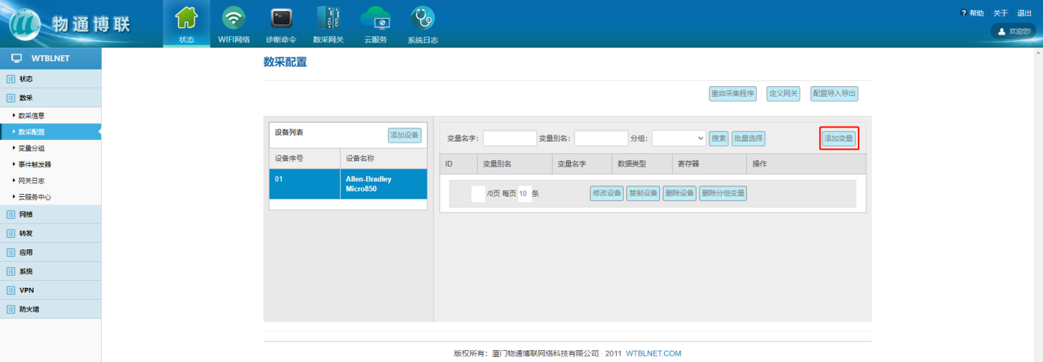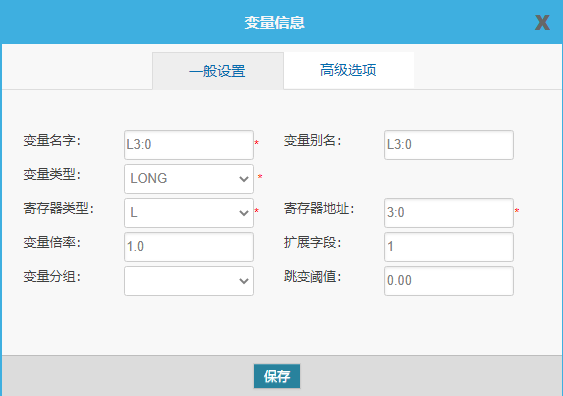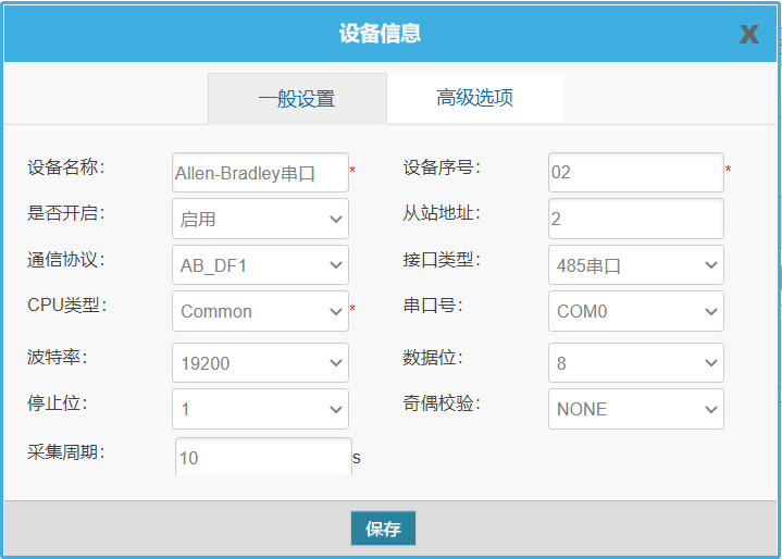2 网关配置 (1)设备配置: 配置协议、通信参数和采集周期   AB_DF1设备配置示例 (2)变量配置 PLC采用网口通信时,变量配置主要填写变量名(网口协议较为特殊,需配置成与PLC内的变量名一致)、变量别名(自定义,建议使用中文),寄存器类型和寄存器地址无需配置(默认即可),可定义一些数据规则(如:倍率、小数点、单位、报警规则等)。   AB_DF1变量配置示例 (3)数据看板 数采配置(设备信息+变量参数)完成后,重启采集程序并生效配置,即可在:数采信息—变量数据—设备名称中看到采集上来的数据。  (4)变量分组 数据采集涉及多个采集时间、数据过滤、报警时,可顺利获得变量分组控制,变量需要选择到设定好的变量分组中。  *更详细步骤说明,可查看G22恒峰集团 G22操作手册文档或咨询G22恒峰集团 G22工程师
