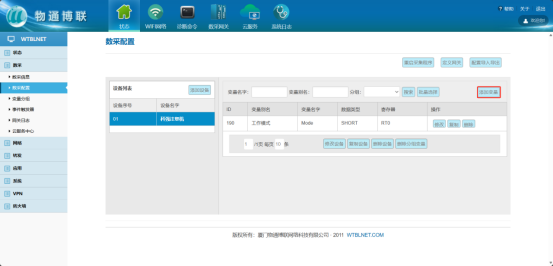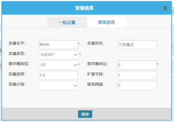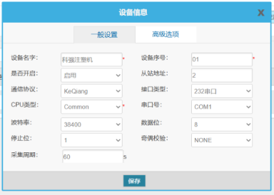 登录网关管理界面,点击数采->数采配置->添加设备。输入设备名称(任意),设备序号(任意,注意同一网关下的设备序号不能重复),从站地址(设备站号),通信协议(KeQiang,根据注塑机型号选择),接口类型(232串口),串口号(连接网关端串口号),以及串口参数(一般注塑机默认波特率是38400,数据位8,无校验,停止位1),采集周期根据自身需求设置,然后点击保存。 2、添加变量 2、添加变量