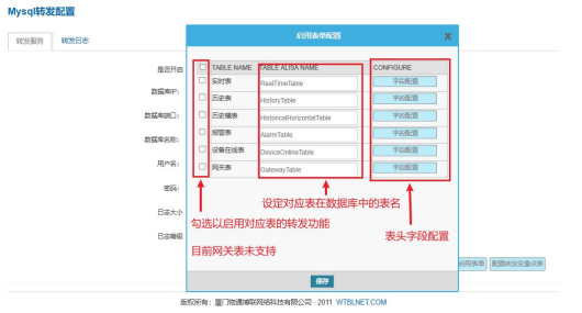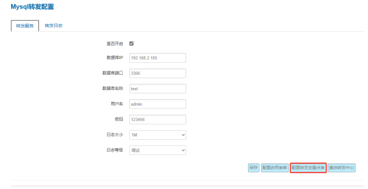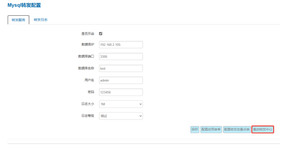 1、登录网关后台,进入数据库配置界面2、配置启用表单,勾选以启用对应表的转发功能,并且可以设置表名称以及表头字段名称 3、配置转发变量点表,也可进入历史横表字段配置 3、配置转发变量点表,也可进入历史横表字段配置 4、配置完成后,点击“重启转发中心”,使配置生效 4、配置完成后,点击“重启转发中心”,使配置生效  免责声明:本网站部分文章、图片等信息来源于网络,版权归原作者平台所有,仅用于学术分享,如不慎侵犯了你的权益,请联系我们,我们将做删除处理!