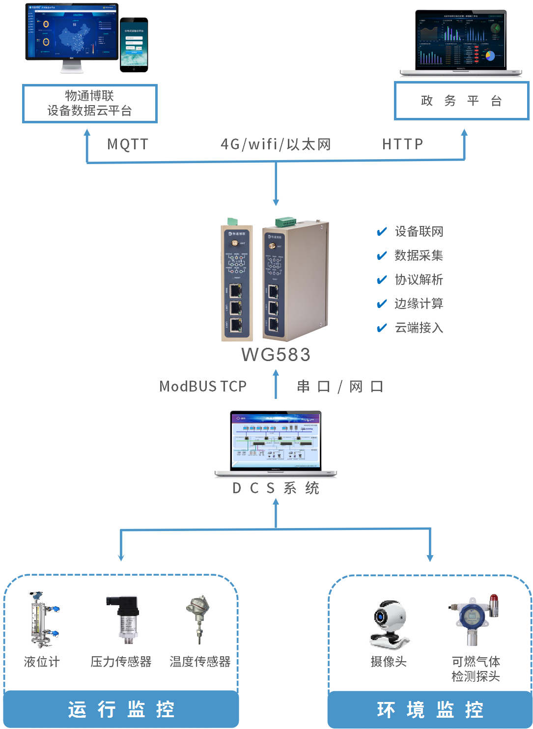 化工厂储罐设备监控及仓储气体监测一体化解决方案2023-05-25 11:21:09 01 行业背景 现代工业开展迅速,自动化和智能化的生产管理模式带来了诸多好处,但生产中存在的安全问题也不能忽视。在化工储罐设备管理中,需要实时监控储罐内温度、压力、液位以及仓储地区的可燃气体浓度,确保储罐设备正常工作和仓储环境安全,从而实现经济效益和安全效益的有机结合。  基于工业物联网系统,顺利获得设备数据采集和实时传输,从而远程监控设备运行参数及周边环境参数,同时实现设备故障快速报警,有助于提高设备管理水平与安防应急能力,对于化工厂的日常运维有重要作用。 02 行业需求 01 采集化工车间内储罐、缓冲罐设备数据并上传到监控平台,查看设备参数和运行状态,故障自动发出报警。 02 采集仓储区域多个可燃气体检测探头设备数据,实时监测仓库可燃气体浓度并在超出阈值时自动报警。 03 管理接入系统的各个设备,查看设备工作状态和参数,顺利获得数据报表分析为工厂的安全和效率提升给予决策支持。 03 解决方案 G22恒峰集团 G22打造的化工储罐设备及仓储气体一体化监测系统,是基于工业智能网关WG583和监控云平台实现的,实现储罐设备和仓储气体的数据采集和远程监控,故障问题快速报警,为化工厂给予高效实用的物联网解决方案。  方案拓扑图 化工车间现场储罐、缓冲罐的温度、压力、液位传感器以及可燃气体检测探头由DCS系统进行控制,工业智能网关WG583只需采集DCS系统内的温度、压力、液位、可燃气体浓度等数据,并顺利获得4G/WIFI/以太网实时上传到监控平台(Modbus TCP转MQTT/HTTP)。管理者可以随时监控储罐、缓冲罐设备的温度、压力、液位及仓储可燃气体浓度等数据变化,并在异常故障时接收到报警通知,快速采取措施进行控制管理,保证设备正常工作和仓库环境安全。 系统功能 01 数据采集监控 网关将采集到储罐、缓冲罐的压力、温度、液位以及可燃气体浓度等数据并实时上传到监控平台(支持本地上位机、G22恒峰集团 G22云、企业自开发云、政务网平台、阿里百度华为云等第三方云)。 02 设备智能管理 顺利获得手机或电脑登录监控平台可以随时查看每台储罐、缓冲罐以及可燃气体检测探头等设备工作状态,也能对网关进行远程配置和智能管理。 03 故障报警通知 顺利获得设定报警阈值和通知方式,在采集到异常数据时自动报警通知到管理和维护人员,支持微信、短信、邮件等方式,方便管理人员快速采取应对措施。 04 数据报表分析 对储罐、缓冲罐的压力、温度、液位及仓库可燃气体浓度等数据进行可视化处理,随时查询实时数据或历史数据,提高数字化设备管理水平,为管理决策给予数据支持。04 方案效益 顺利获得建立化工储罐及仓储气体在线监测一体化系统,可以实时监控各个重要参数并进行预警报警,能够快速发现问题并解决问题,为保障设备稳定运行与仓储环境安全给予高效便利的管理手段,助推化工厂的数字化进程。 相关产品: WG系列工业智能网关  G22恒峰集团 G22·WG系列工业智能网关是一款支持采集各种PLC,仪器仪表,水环保,电力设备,CNC等各种工业设备数据,具有协议解析,边缘计算的高可靠性工业智能网关,是构建工业互联网系统的核心边缘节点。 工业设备数据云平台  G22恒峰集团 G22·工业设备数据云平台是一款高并发的工业设备远程管理和工业设备数据可视化的云平台,实现对海量实时数据,历史数据、报警数据、视频数据的监控,顺利获得组态功能、报表分析、大屏展示实现数据分析和可视化应用,实现远程监控及设备远程运营管理。
