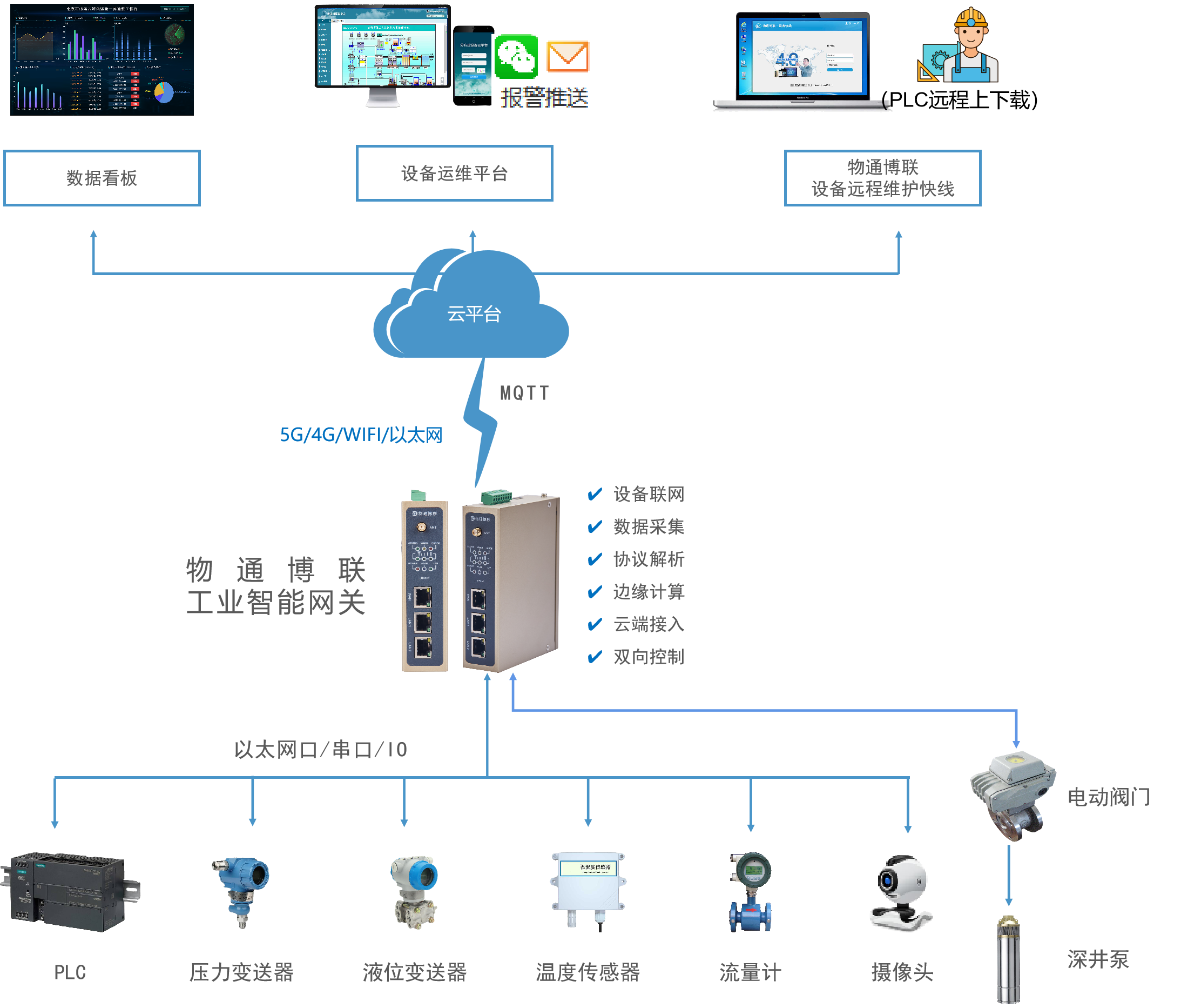 温泉供水泵站远程监控系统解决方案2024-05-13 10:35:26 行业背景 随着休闲旅游产业的快速开展和人们对健康生活方式的追求,温泉度假村、SPA中心等场所日益受到消费者的青睐。温泉供水泵站作为这些设施的核心组成部分,其稳定、高效运行对于保障温泉服务质量至关重要。 现在温泉公司泵站为单机运行,传统的温泉供水泵站管理方式往往依赖于调度电话询问、操作岗位报告和调度员、工艺员下现场检查等人工管理维护,存在诸多局限性,不能及时掌握生产运行状况并耗费大量的人力物力增加运营成本。 在此背景下,引入温泉供水泵站远程监控系统,利用现代技术手段实现供水泵站的远程监控与智能化管理,已成为行业开展的必然趋势。 行业痛点 01 人工巡检效率低下 传统的供水泵站管理依赖于人工巡检,巡检周期长,难以实时掌握泵站运行状况,调度可能出现延时,影响客户体验 02 故障响应速度慢 人工巡检难以做到24小时不间断监控,一旦发生故障,难以迅速响应,影响供水安全和影响用户体验。 03 数据管理不规范 缺乏统一的数据管理平台,数据收集、整理和分析存在困难,难以为决策给予支持,无法做到降本增效。 解决方案 G22恒峰集团 G22温泉供水泵站远程监控系统解决方案,集成物联网、云计算、大数据等先进技术,实现对泵站的全方位、智能化管理。 顺利获得G22恒峰集团 G22工业智能网关采集解析现场泵站中的PLC、压力变送器、温度传感器、液位变送器、流量计等设备运行状态和运行数据,再顺利获得4G网络将数据上传到云平台进行远程监控,平台可视化展示泵站数据和运行情况,管理运维人员可以顺利获得PC端平台和手机端小程序随时随地监控现场泵站情况,实现远程管理、故障报警、远程维护、数据分析等功能,同时云平台支持下控网关,可以对电动阀门写入开关值,实现远程启停泵站设备,做到实时在线、无人值守,降低运维人力成本。  方案功能 01 数据采集 G22恒峰集团 G22工业智能网关部署在泵站现场,具备强大的协议解析能力,能够无缝对接泵站中的PLC、压力变送器、温度传感器、液位变送器、流量计、摄像头等设备,实时采集并精准解析其运行状态和数据,并将数据上传到云平台进行监控。 02 站点管理 将各个站点的数据统一接入,管理人员可以清晰查看各泵站的基本信息、设备配置、运维记录等,实现对所有站点的集中、统一管理,提升管理效率。 03 实时监控 云平台顺利获得大屏、报表等多种方式实时展示各泵站的运行状态及各项关键参数,支持多维度、多视角的数据展示与对比分析。管理人员顺利获得PC端平台或手机端小程序,可随时随地查看泵站实时运行情况,对设备状态、工艺流程等进行实时监控。 04 故障报警 实时监测泵站设备运行数据,当检测到设备异常或运行参数超出预设阈值时,立即触发报警通知,并顺利获得短信、邮件、微信、APP推送等多种方式,迅速通知相关运维人员,确保故障能得到及时响应。 05 远程维护 顺利获得G22恒峰集团 G22设备维护快线,可以对PLC进行远程控制、调整参数或工作模式,也能实现PLC的远程编程调试和远程上下载程序等操作,减少现场维护工作,提升维护效率。 06 远程控制 平台支持远程控制,管理人员可根据实际需求,顺利获得平台远程设定设备运行参数、调整工艺流程、启停设备等,实现对泵站设备的精细化、远程化管理。 07 数据分析 平台运用大数据分析技术,对历史运行数据进行深度挖掘,形成设备性能评估报告、故障预测模型等,为设备维护计划制定、运行策略优化给予科学依据。08 系统效益 1、提升服务质量: 实时监控与预警功能确保泵站故障能够得到及时发现与处理,显著减少因设备故障导致的服务中断,提升温泉服务质量及用户满意度。 2、降本增效:远程控制与调度大幅减少人工巡检工作量,缩短故障排查与修复时间,降低运维成本。同时,顺利获得预防性维护和能效优化,延长设备使用寿命,节省设备更新换代费用。 3、节能降耗:顺利获得对泵站运行数据的精细化管理,实现设备运行状态的动态调整,避免能源浪费,节约成本。 4、优化决策支持:顺利获得数据分析,为管理人员给予科学的决策支持,促进企业的可持续开展。