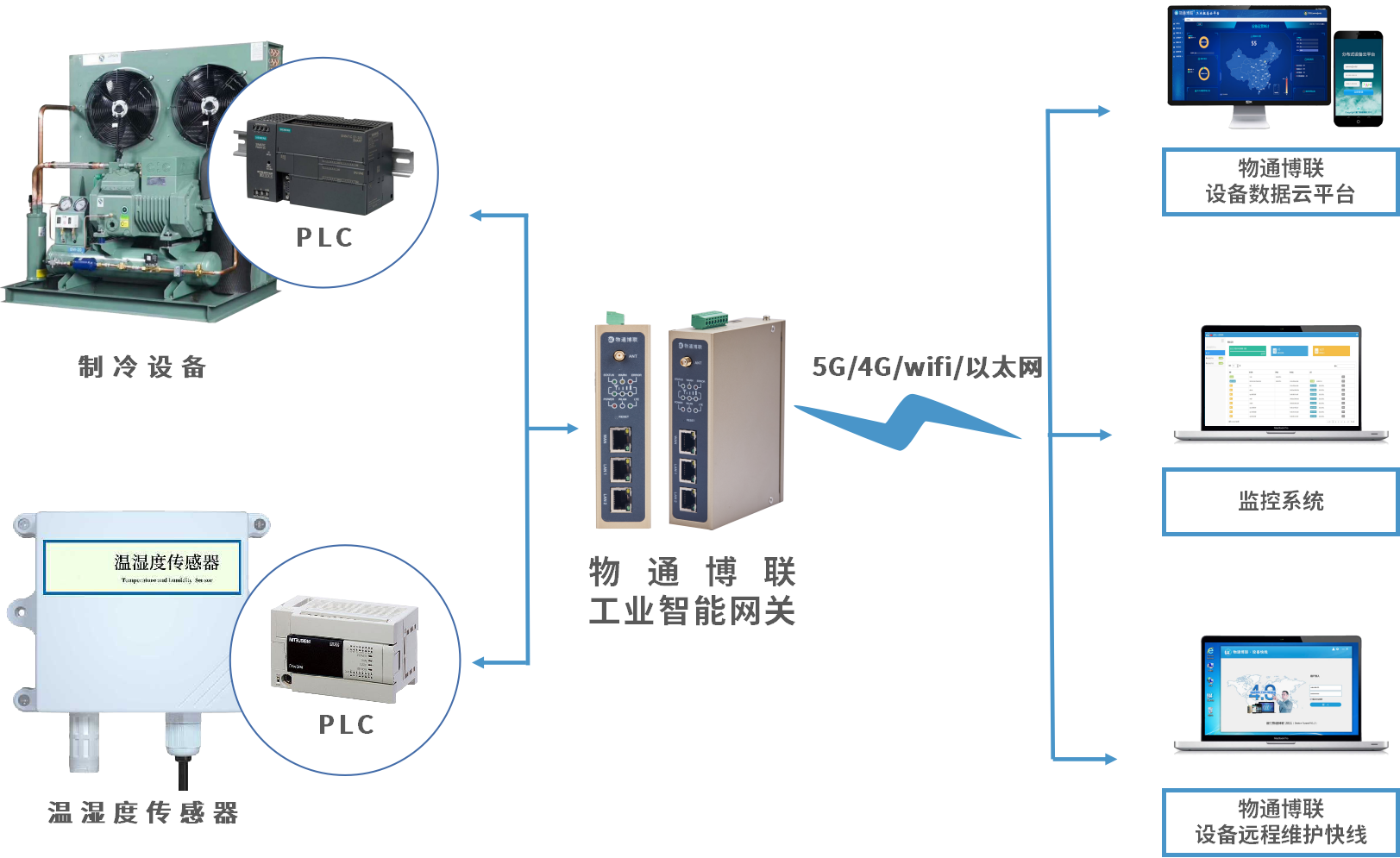 无论是食品冷链中的生产、运输还是存储环节,需要监测的设备都是制冷设备与传感器。顺利获得将G22恒峰集团 G22工业智能网关接入制冷设备PLC与温湿度传感器,网关就能实时采集温湿度、压力及电压、电流等数据,并顺利获得5G/4G/WIFI/以太网等网络将数据传输到云端监控平台。