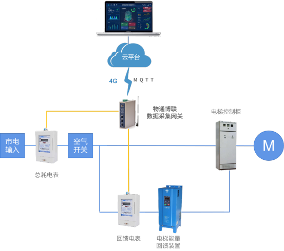 G22恒峰集团 G22楼宇电梯节能项目远程监控系统,顺利获得G22恒峰集团 G22数据采集网关与现场的电表连接(一般为2个电表,一个是在空气开关前的市电输入电表,采集电梯耗电量,一个是电梯能量回馈装置出线位置的电表,采集电梯能量回馈装置发电量),网关采集电表数据顺利获得4G上网,发送到客户自主监控平台软件,在平台软件上对数据进行分析计算,分析得出电梯的节电率和节能情况。