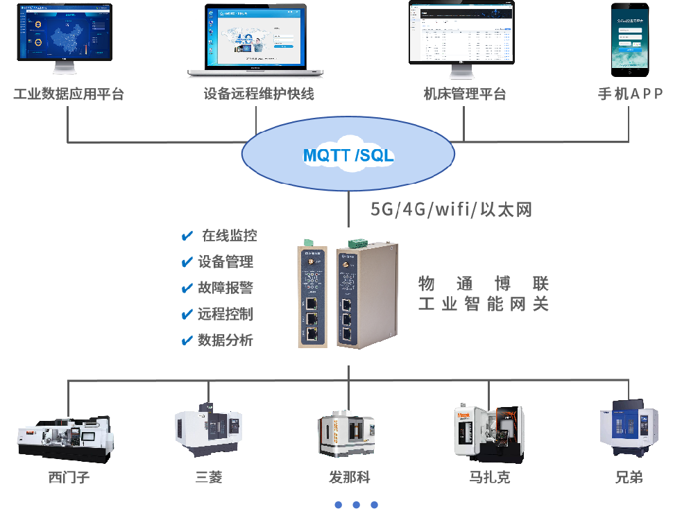 网关具备多个串口网口与协议解析能力,能够接入PLC、数控机床、注塑机、工业机器人、仪器仪表、传感器等设备,实现全天候、自动化的数据采集工作。